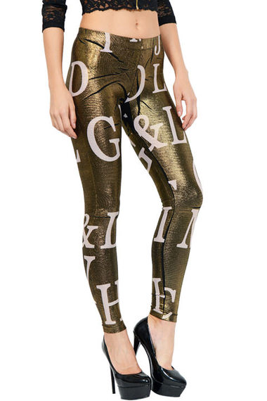 Молодежные лосины из полиэстеровой ткани с золотистым отливом. Модель на поясе-резинке,декорирована стильным текстовым принтом.
